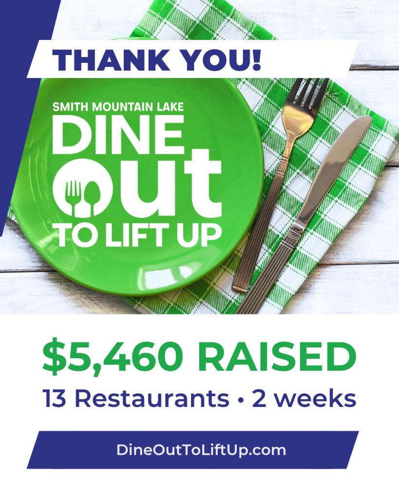 We’re so excited to announce that the inaugural 𝗗𝗶𝗻𝗲 𝗢𝘂𝘁 𝘁𝗼 𝗟𝗶𝗳𝘁 𝗨𝗽 raised $5,460 to fight hunger at Smith Mountain Lake!