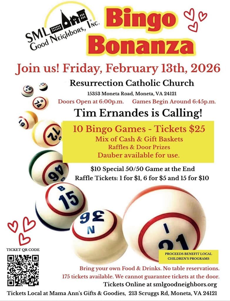 Bingo Bonanza: A fundraiser for SML Good Neighbors. Doors open at 6 p.m. and games begin at 6:45 in the lower level of Resurrection Catholic Church.