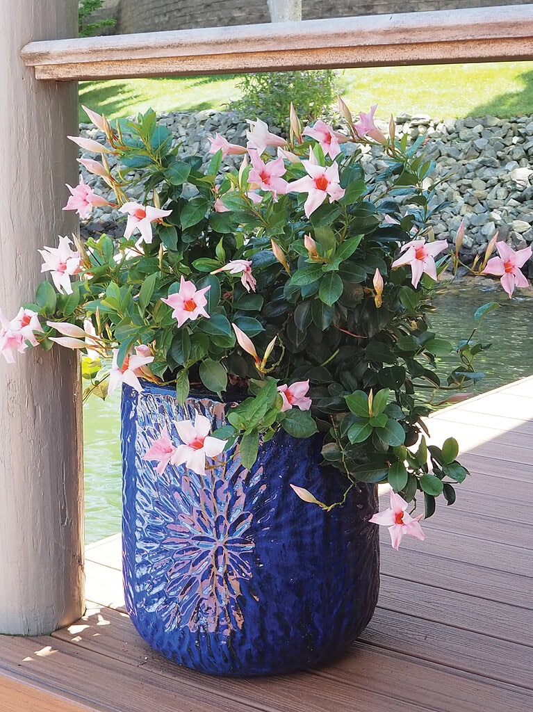 Welch recommended Mandevilla or Dipladenia as all-in-one “thriller, filler and spiller” plants for large containers. Portulaca is a low-maintenance choice for hot, dry spots. Creeping jenny and sweet potato vine are great spillers and annual euphorbia is a drought-tolerant filler.